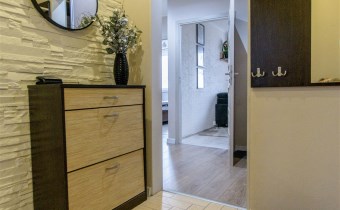 Mieszkanie jest bardzo gustownie urządzone. W pokojach i przedpokojach wykonano sufity podwieszane, na ścianach znajdują się tapety, natomiast na podłogach położono kafelki oraz panele.